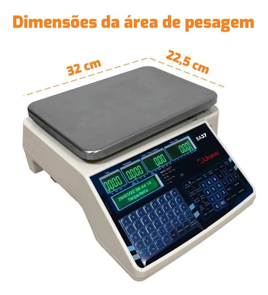 .A Balança BA37 da Urano é uma solução completa e inovadora para o gerenciamento e comercialização de produtos pesáveis, oferecendo novas tecnologias e funcionalidades avançadas. Com capacidade máxima de pesagem de 31kg, ela se adapta tanto a produtos de alto valor em pequenas quantidades quanto a itens de baixo valor em grandes volumes. Seu novo design inclui um mecanismo impressor resistente e de fácil manuseio, permitindo trocas rápidas do rolo de etiquetas e impressão de diversos formatos de códigos de barras, incluindo o Code 128, ideal para controle de validade dos alimentos. Além disso, a balança conta com displays de alta visibilidade e teclas de acesso rápido que suportam até 120 produtos, garantindo agilidade no atendimento. Especificações Técnicas: – Capacidade x divisão: 6kg/15kg/31kg x 2g/5g/10g – tríplice escala.(0 a 6 kg, divisão de 2g; 6,005 a 15kg, divisão de 5g e de 15,010 a 31kg, divisão de 10g); – Wi-Fi/ethernet. Permite o endereçamento de IP FIXO ou DHCP; – Display/visor de mensagens Display de LCD verde com backlight de alto brilho e display matricial verde para maior visibilidade do nome do produto e outros comandos;